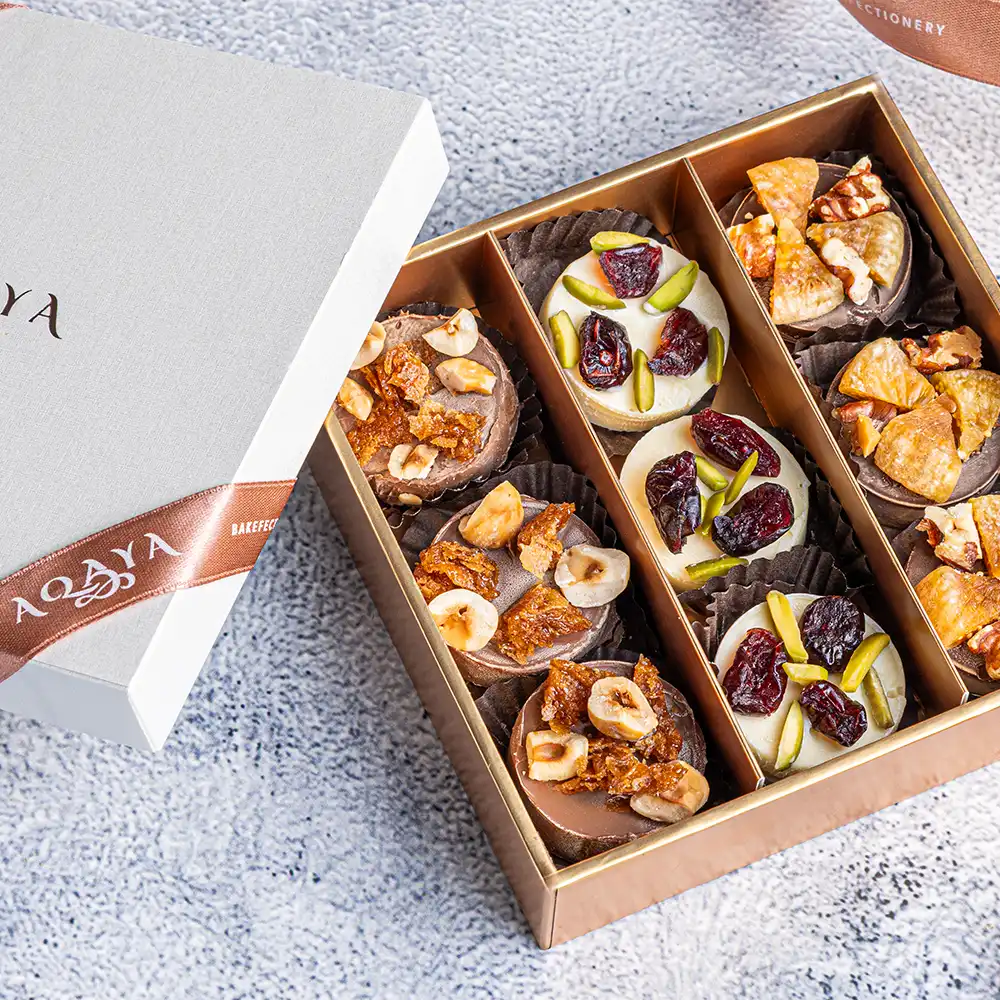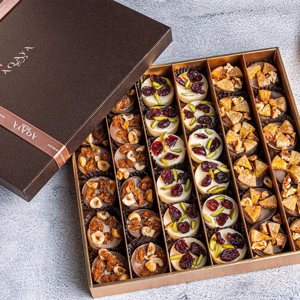 صندوق من أنواع الميندينت المتنوعة يتكون من 3 نكهات مختلفة: الشوكولاتة البيضاء، شوكولاتة الحليب والشوكولاتة الداكنة.