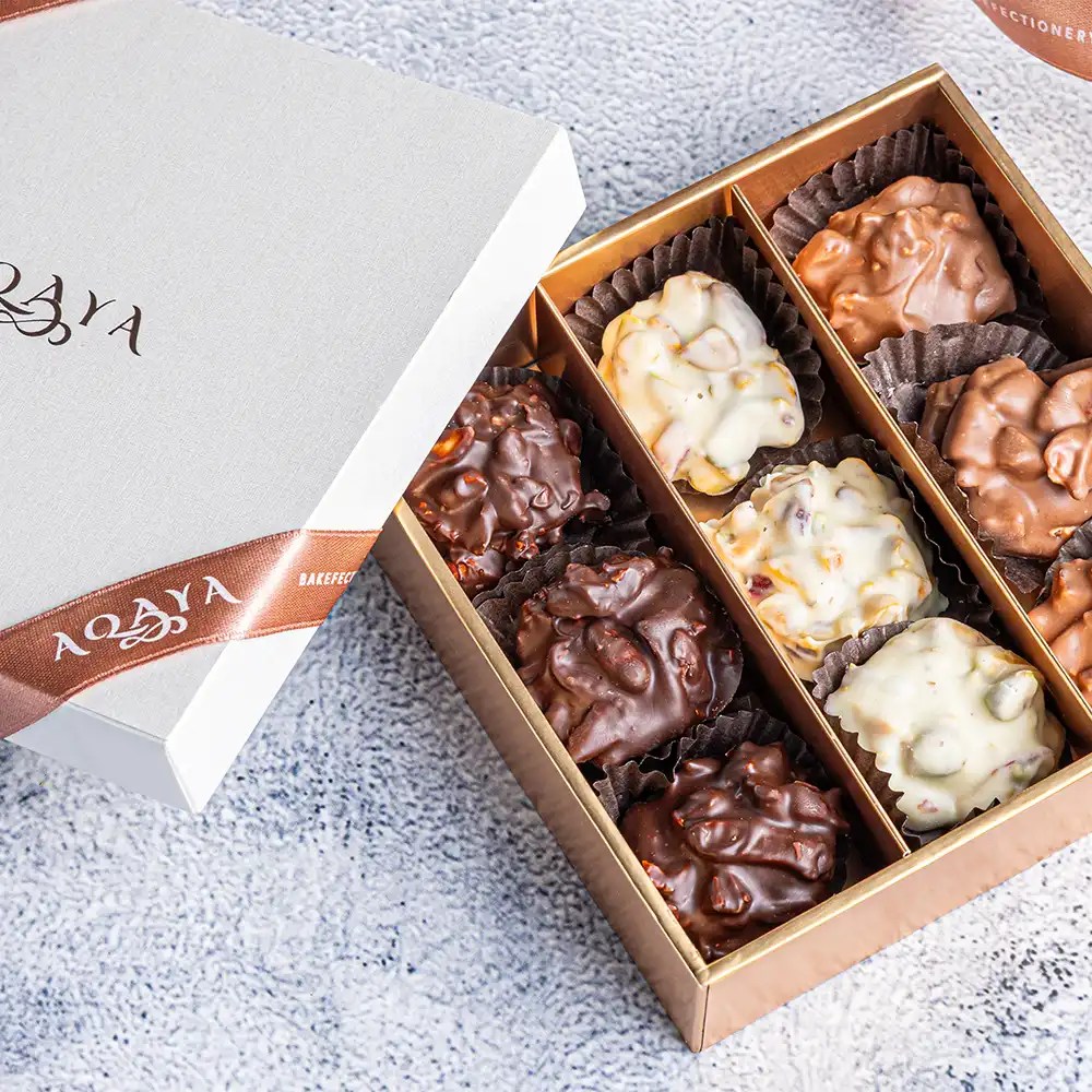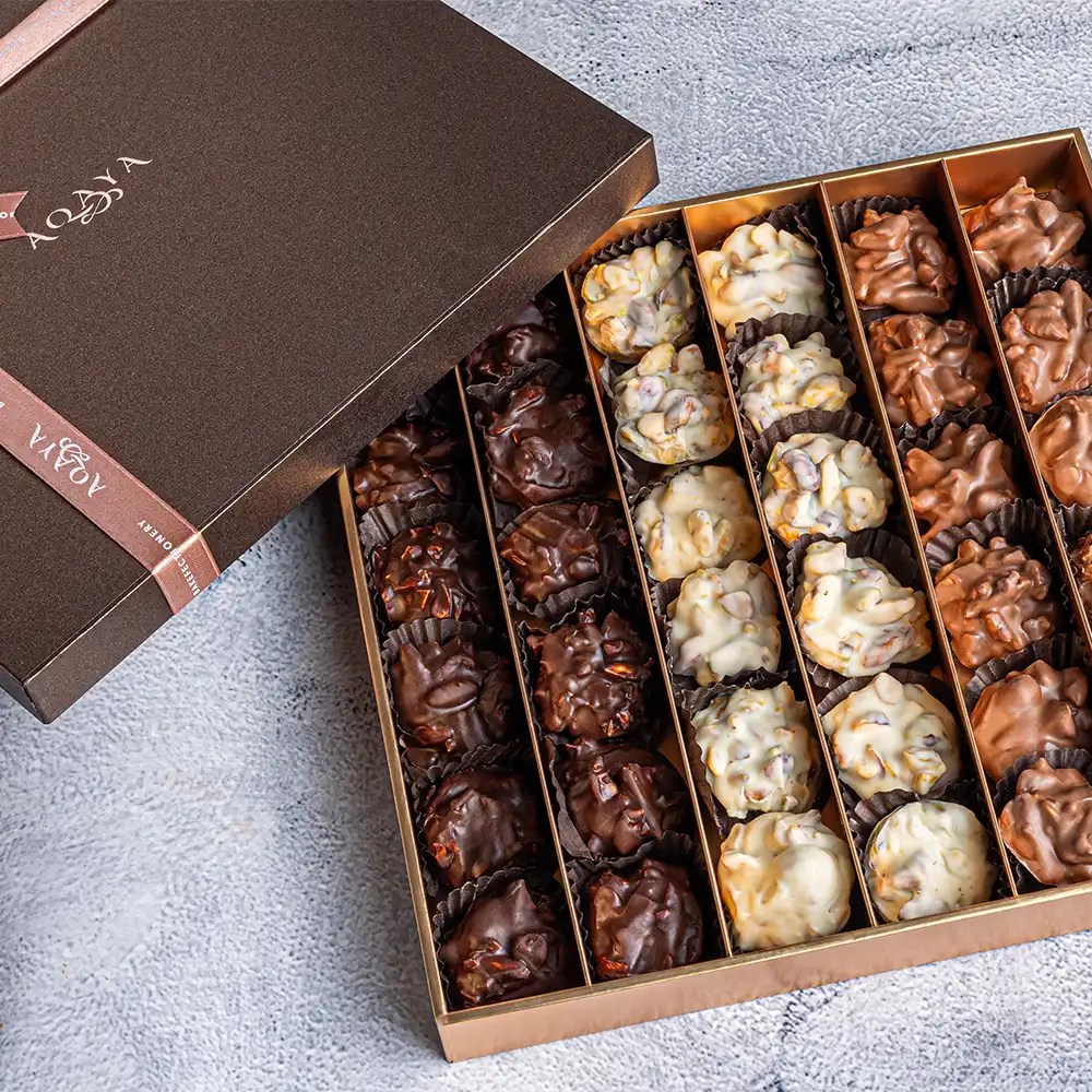 A box of assorted nut clusters consisting of 3 different flavours: white chocolate pistachio, milk chocolate pecan, dark chocolate almond.